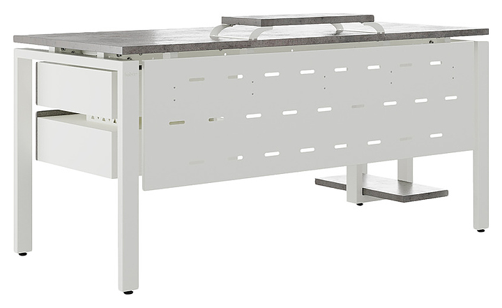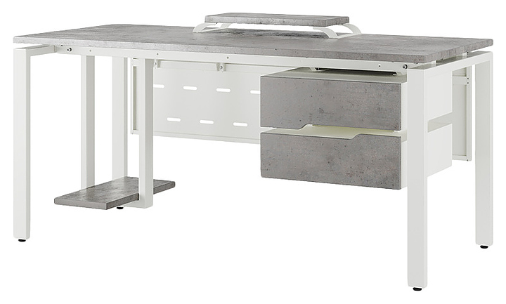 Офисный стол Кобор P-160/80 white/chicago используется в офисных помещениях и кабинетах руководителей. Модель оснащена П-образными опорами. Каркас выполнен из металла, выкрашенного в цвет белый муар (RAL9016), столешница – из ламинированной древесно-стружечной плиты (ЛДСП) цвета бетон чикаго (F186 ST9). Опции (заказываются отдельно):