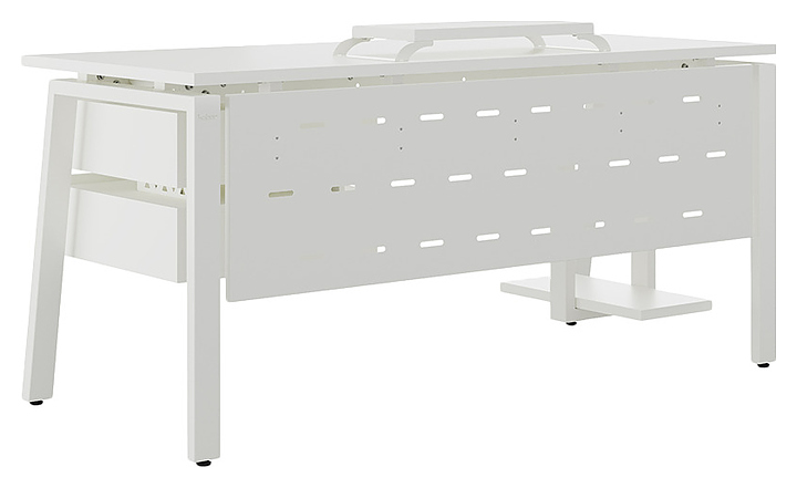 Офисный стол Кобор AB-160/80 white/premium используется в офисных помещениях и кабинетах руководителей. Модель оснащена A-образными опорами со скошенными фронтальными сегментами. Каркас выполнен из металла, выкрашенного в цвет белый муар (RAL9016), столешница – из ламинированной древесно-стружечной плиты (ЛДСП) цвета белый премиум (W1000 ST9). Опции (заказываются отдельно):