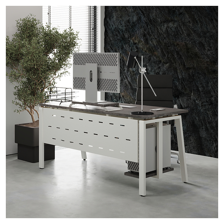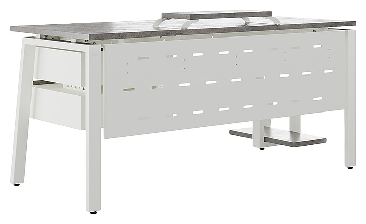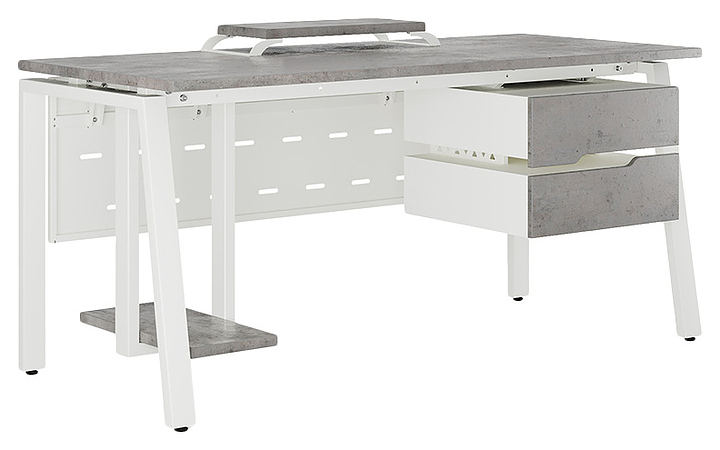 Офисный стол Кобор AB-160/80 white/chicago используется в офисных помещениях и кабинетах руководителей. Модель оснащена A-образными опорами со скошенными фронтальными сегментами. Каркас выполнен из металла, выкрашенного в цвет белый муар (RAL9016), столешница – из ламинированной древесно-стружечной плиты (ЛДСП) цвета бетон чикаго (F186 ST9). Опции (заказываются отдельно):