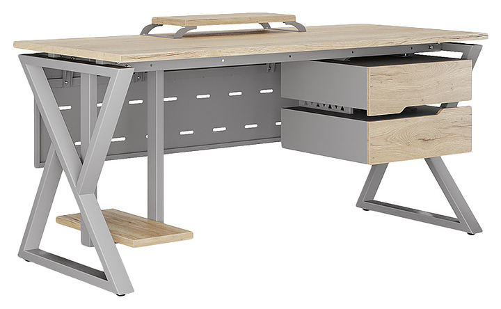 Офисный стол Кобор W-100/60 aluminum/natural используется в офисных помещениях и кабинетах руководителей. Модель оснащена W-образными опорами. Каркас выполнен из металла, выкрашенного в цвет алюминиевый металлик (RAL9006), столешница – из ламинированной древесно-стружечной плиты (ЛДСП) цвета натуральный дуб (H1180 ST37). Опции (заказываются отдельно):