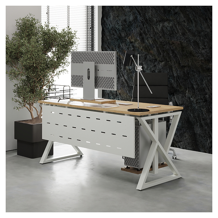 Офисный стол Кобор W-100/70 white/natural используется в офисных помещениях и кабинетах руководителей. Модель оснащена W-образными опорами. Каркас выполнен из металла, выкрашенного в цвет белый муар (RAL9016), столешница – из ламинированной древесно-стружечной плиты (ЛДСП) цвета натуральный дуб (H1180 ST37). Опции (заказываются отдельно):