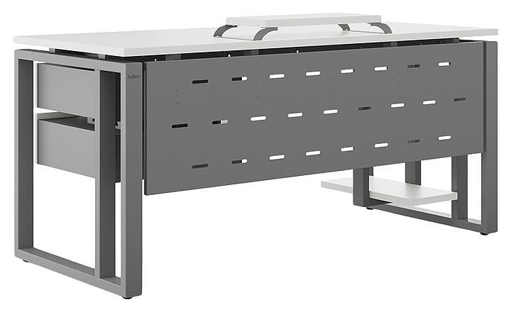 Офисный стол Кобор O2-100/70 aluminum/premium используется в офисных помещениях и кабинетах руководителей. Модель оснащена усиленными вертикальной балкой O-образными опорами. Каркас выполнен из металла, выкрашенного в цвет алюминиевый металлик (RAL9006), столешница – из ламинированной древесно-стружечной плиты (ЛДСП) цвета белый премиум (W1000 ST9). Опции (заказываются отдельно):