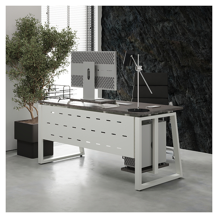Офисный стол Кобор TS1-120/70 white/chicago используется в офисных помещениях и кабинетах руководителей. Модель оснащена опорами в форме наклонной трапеции. Каркас выполнен из металла, выкрашенного в цвет белый муар (RAL9016), столешница – из ламинированной древесно-стружечной плиты (ЛДСП) цвета бетон чикаго (F186 ST9). Опции (заказываются отдельно):