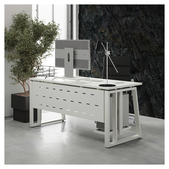 Офисный стол Кобор TS2-120/80 white/premium используется в офисных помещениях и кабинетах руководителей. Модель оснащена усиленными вертикальными балками опорами в форме наклонной трапеции. Каркас выполнен из металла, выкрашенного в цвет белый муар (RAL9016), столешница – из ламинированной древесно-стружечной плиты (ЛДСП) цвета белый премиум (W1000 ST9). Опции (заказываются отдельно):
