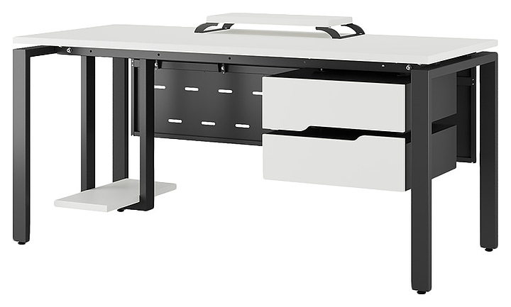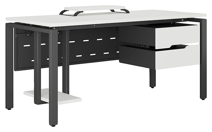 Компьютерный стол Кобор KP-160/70 black/premium используется в офисных помещениях и кабинетах руководителей. Модель оснащена П-образными опорами. Каркас выполнен из металла, выкрашенного в цвет черный муар (RAL9005), столешница – из ламинированной древесно-стружечной плиты (ЛДСП) цвета белый премиум (W1000 S9). Опции (заказываются отдельно):