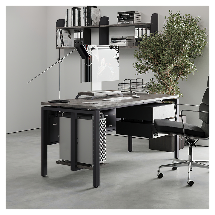 Компьютерный стол Кобор KP-160/80 graphite/chicago используется в офисных помещениях и кабинетах руководителей. Модель оснащена П-образными опорами. Каркас выполнен из металла, выкрашенного в цвет графит муар (RAL7024), столешница – из ламинированной древесно-стружечной плиты (ЛДСП) цвета бетон чикаго (F186 ST9). Опции (заказываются отдельно):