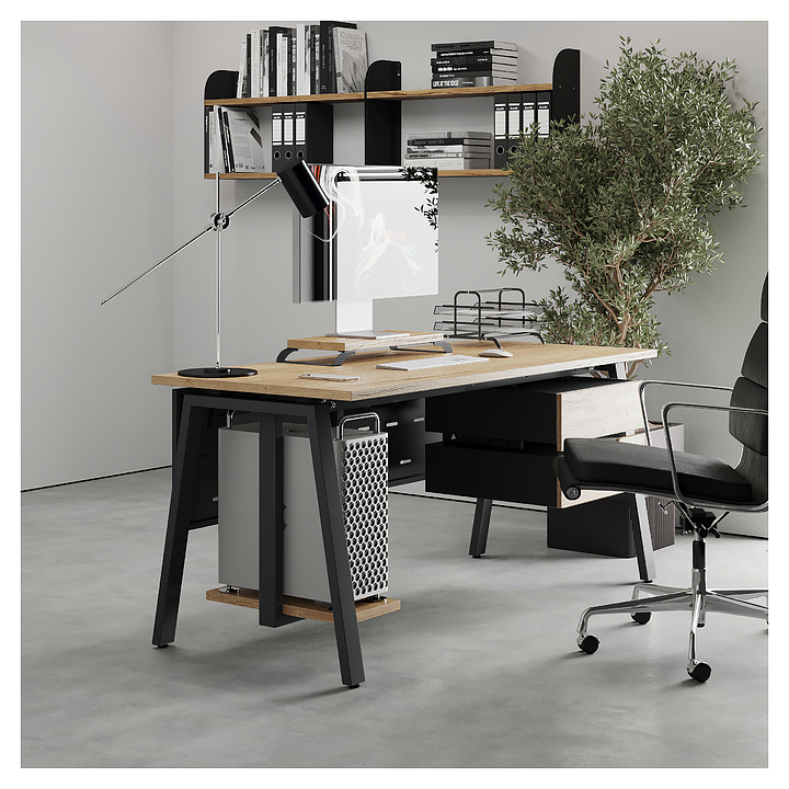 Компьютерный стол Кобор KA-160/80 black/natural используется в офисных помещениях и кабинетах руководителей. Модель оснащена A-образными опорами. Каркас выполнен из металла, выкрашенного в цвет черный муар (RAL9005), столешница – из ламинированной древесно-стружечной плиты (ЛДСП) цвета натуральный дуб (H1180 ST37). Опции (заказываются отдельно):