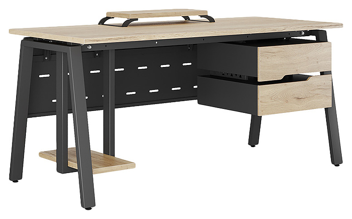 Компьютерный стол Кобор КA-80/80 black/natural используется в офисных помещениях и кабинетах руководителей. Модель оснащена A-образными опорами. Каркас выполнен из металла, выкрашенного в цвет черный муар (RAL9005), столешница – из ламинированной древесно-стружечной плиты (ЛДСП) цвета натуральный дуб (H1180 ST37). Опции (заказываются отдельно):