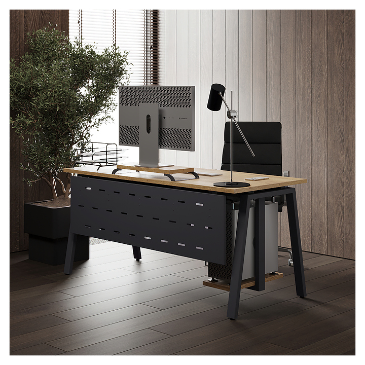 Компьютерный стол Кобор КA-160/80 graphite/natural используется в офисных помещениях и кабинетах руководителей. Модель оснащена A-образными опорами. Каркас выполнен из металла, выкрашенного в цвет графит муар (RAL7024), столешница – из ламинированной древесно-стружечной плиты (ЛДСП) цвета натуральный дуб (H1180 ST37). Опции (заказываются отдельно):