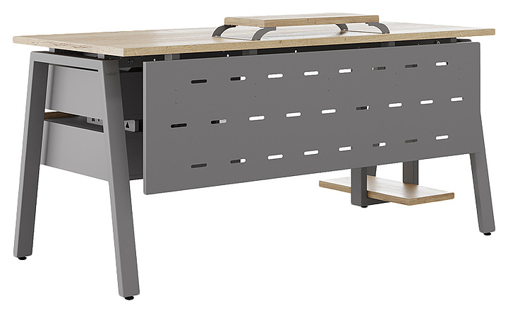 Компьютерный стол Кобор KA-180/70 aluminum/natural используется в офисных помещениях и кабинетах руководителей. Модель оснащена A-образными опорами. Каркас выполнен из металла, выкрашенного в цвет алюминиевый металлик (RAL9006), столешница – из ламинированной древесно-стружечной плиты (ЛДСП) цвета натуральный дуб (H1180 ST37). Опции (заказываются отдельно):