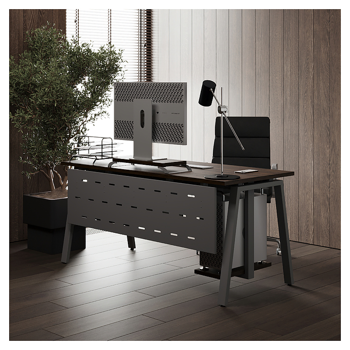 Компьютерный стол Кобор KA-100/80 aluminum/charlston используется в офисных помещениях и кабинетах руководителей. Модель оснащена A-образными опорами. Каркас выполнен из металла, выкрашенного в цвет алюминиевый металлик (RAL9006), столешница – из ламинированной древесно-стружечной плиты (ЛДСП) цвета дуб чарльстон (H3154 ST36). Опции (заказываются отдельно):