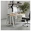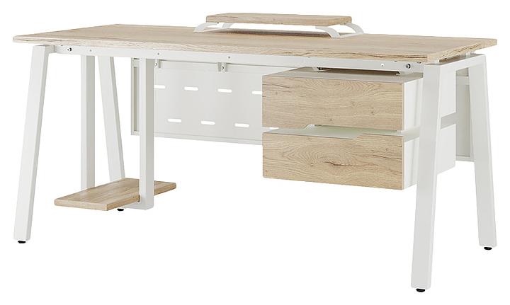 Компьютерный стол Кобор KA-120/80 white/natural используется в офисных помещениях и кабинетах руководителей. Модель оснащена A-образными опорами. Каркас выполнен из металла, выкрашенного в цвет белый муар (RAL9016), столешница – из ламинированной древесно-стружечной плиты (ЛДСП) цвета натуральный дуб (H1180 ST37). Опции (заказываются отдельно):