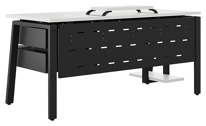 Компьютерный стол Кобор КAB-140/70 black/premium используется в офисных помещениях и кабинетах руководителей. Модель оснащена A-образными опорами со скошенными фронтальными сегментами. Каркас выполнен из металла, выкрашенного в цвет черный муар (RAL9005), столешница – из ламинированной древесно-стружечной плиты (ЛДСП) цвета белый премиум (W1000 S9). Опции (заказываются отдельно):