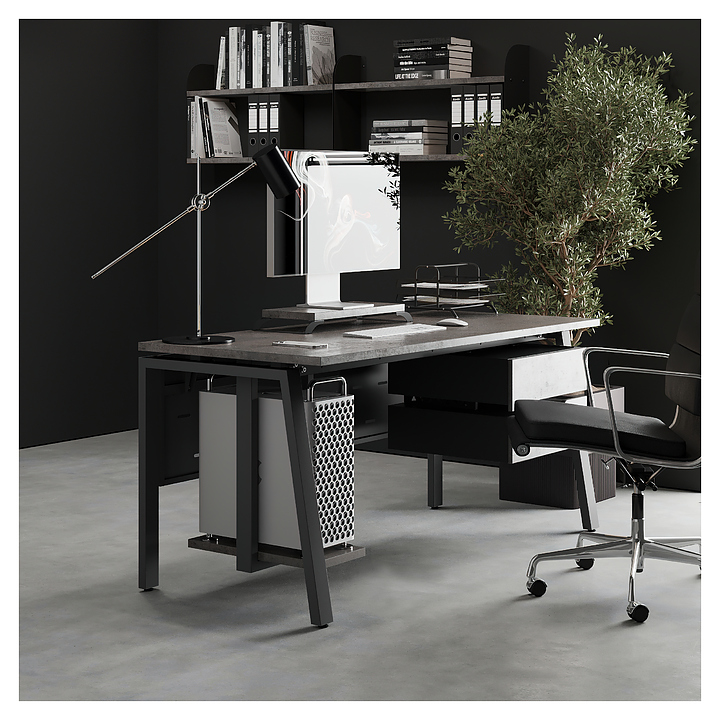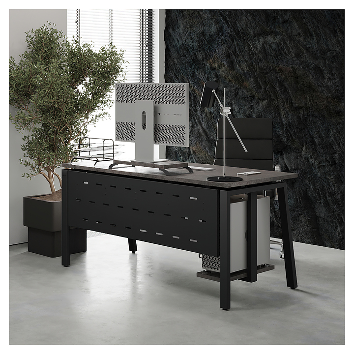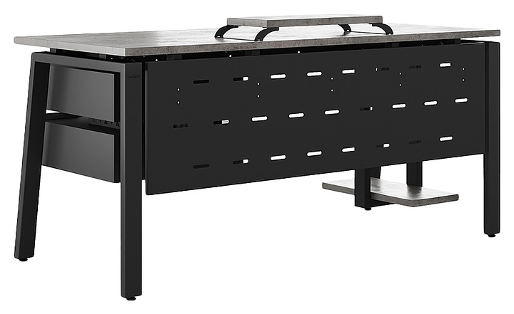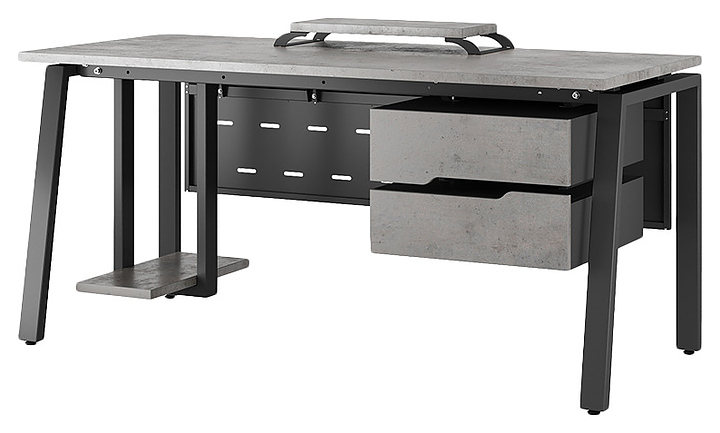 Компьютерный стол Кобор KAB-160/80 black/chicago используется в офисных помещениях и кабинетах руководителей. Модель оснащена A-образными опорами со скошенными фронтальными сегментами. Каркас выполнен из металла, выкрашенного в цвет черный муар (RAL9005), столешница – из ламинированной древесно-стружечной плиты (ЛДСП) цвета бетон чикаго (F186 ST9). Опции (заказываются отдельно):