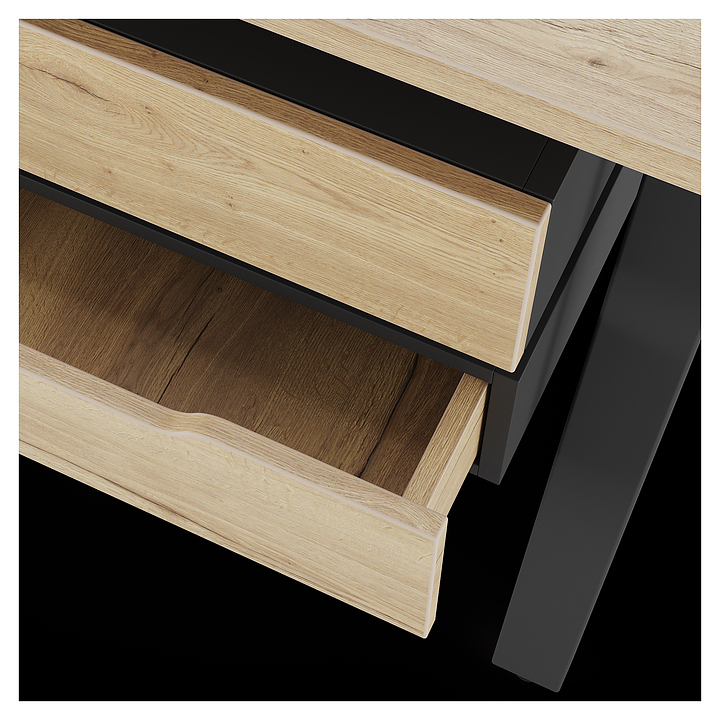 Компьютерный стол Кобор KAB-140/80 black/natural используется в офисных помещениях и кабинетах руководителей. Модель оснащена A-образными опорами со скошенными фронтальными сегментами. Каркас выполнен из металла, выкрашенного в цвет черный муар (RAL9005), столешница – из ламинированной древесно-стружечной плиты (ЛДСП) цвета натуральный дуб (H1180 ST37). Опции (заказываются отдельно):
