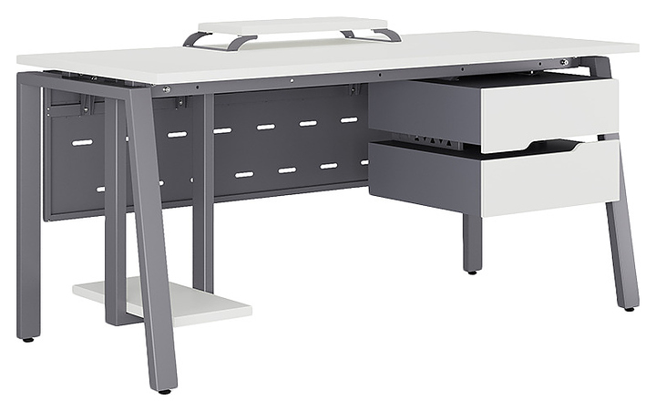 Компьютерный стол Кобор KAB-160/80 graphite/premium используется в офисных помещениях и кабинетах руководителей. Модель оснащена A-образными опорами со скошенными фронтальными сегментами. Каркас выполнен из металла, выкрашенного в цвет графит муар (RAL7024), столешница – из ламинированной древесно-стружечной плиты (ЛДСП) цвета белый премиум (W1000 ST9). Опции (заказываются отдельно):
