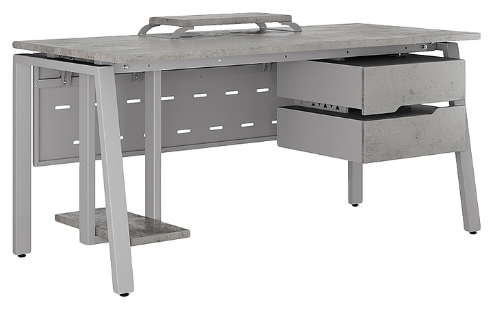 Компьютерный стол Кобор КAB-160/80 aluminum/chicago используется в офисных помещениях и кабинетах руководителей. Модель оснащена A-образными опорами со скошенными фронтальными сегментами. Каркас выполнен из металла, выкрашенного в цвет алюминиевый металлик (RAL9006), столешница – из ламинированной древесно-стружечной плиты (ЛДСП) цвета бетон чикаго (F186 ST9). Опции (заказываются отдельно):