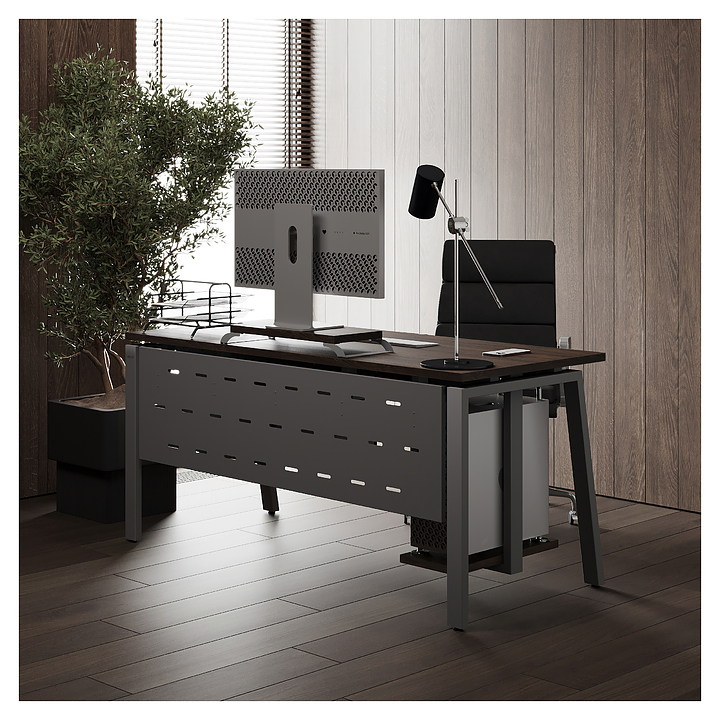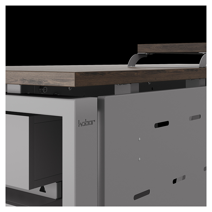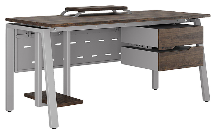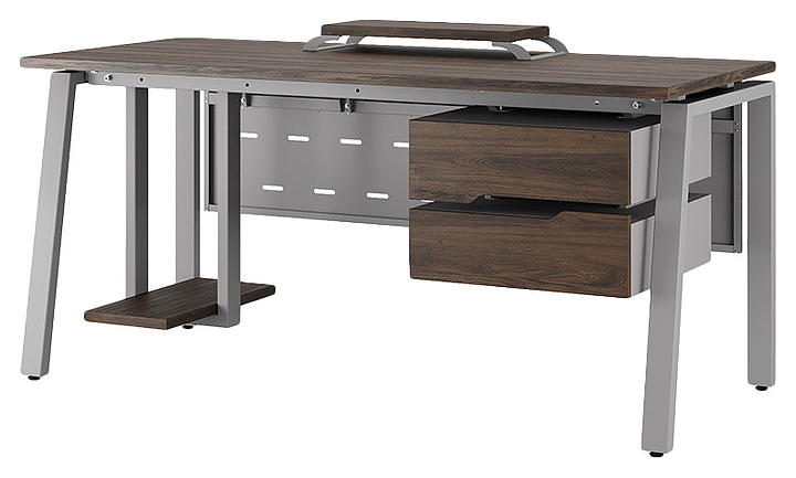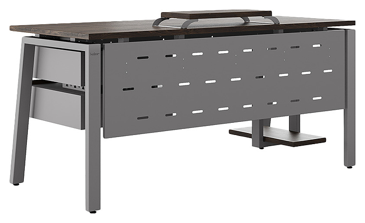 Компьютерный стол Кобор KAB-160/80 aluminum/charlston используется в офисных помещениях и кабинетах руководителей. Модель оснащена A-образными опорами со скошенными фронтальными сегментами. Каркас выполнен из металла, выкрашенного в цвет алюминиевый металлик (RAL9006), столешница – из ламинированной древесно-стружечной плиты (ЛДСП) цвета дуб чарльстон (H3154 ST36). Опции (заказываются отдельно):