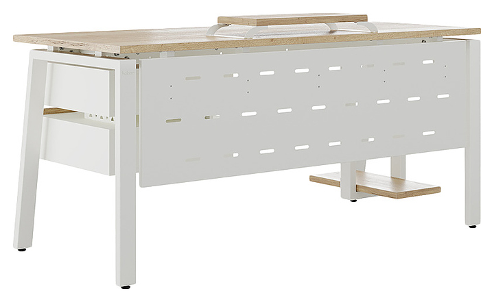 Компьютерный стол Кобор КAB-100/80 white/natural используется в офисных помещениях и кабинетах руководителей. Модель оснащена A-образными опорами со скошенными фронтальными сегментами. Каркас выполнен из металла, выкрашенного в цвет белый муар (RAL9016), столешница – из ламинированной древесно-стружечной плиты (ЛДСП) цвета натуральный дуб (H1180 ST37). Опции (заказываются отдельно):