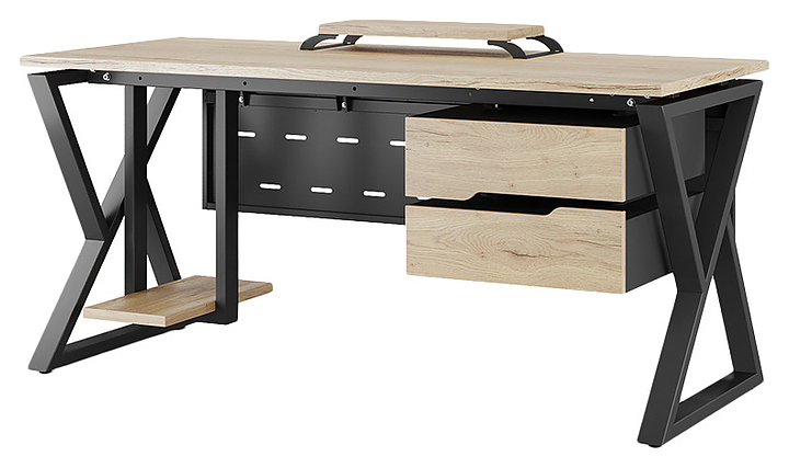 Компьютерный стол Кобор КW-100/70 black/natural используется в офисных помещениях и кабинетах руководителей. Модель оснащена W-образными опорами. Каркас выполнен из металла, выкрашенного в цвет черный муар (RAL9005), столешница – из ламинированной древесно-стружечной плиты (ЛДСП) цвета натуральный дуб (H1180 ST37). Опции (заказываются отдельно):