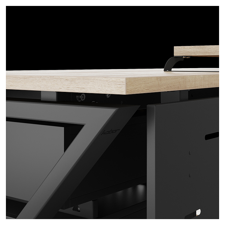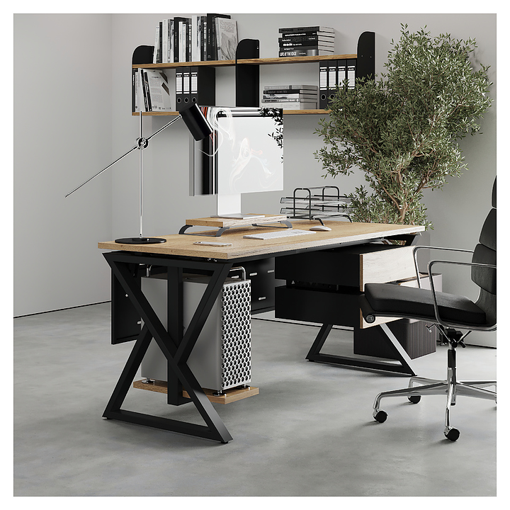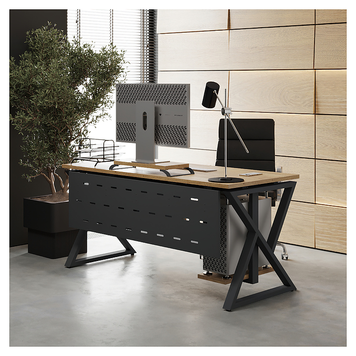 Компьютерный стол Кобор КW-100/80 black/natural используется в офисных помещениях и кабинетах руководителей. Модель оснащена W-образными опорами. Каркас выполнен из металла, выкрашенного в цвет черный муар (RAL9005), столешница – из ламинированной древесно-стружечной плиты (ЛДСП) цвета натуральный дуб (H1180 ST37). Опции (заказываются отдельно):