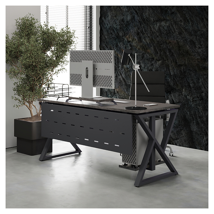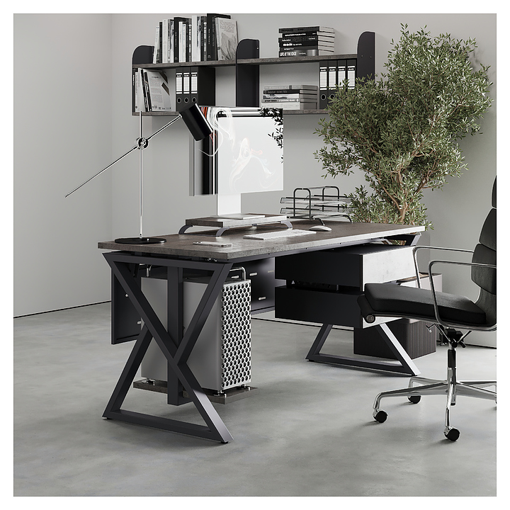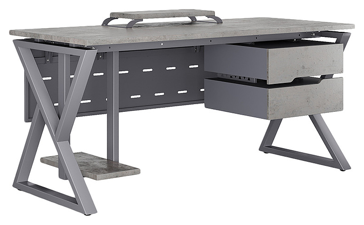 Компьютерный стол Кобор КW-140/60 graphite/chicagoиспользуется в офисных помещениях и кабинетах руководителей. Модель оснащена W-образными опорами. Каркас выполнен из металла, выкрашенного в цвет графит муар (RAL7024), столешница – из ламинированной древесно-стружечной плиты (ЛДСП) цвета бетон чикаго (F186 ST9). Опции (заказываются отдельно):