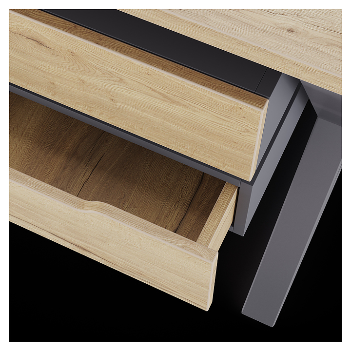 Компьютерный стол Кобор КW-100/60 graphite/natural используется в офисных помещениях и кабинетах руководителей. Модель оснащена W-образными опорами. Каркас выполнен из металла, выкрашенного в цвет графит муар (RAL7024), столешница – из ламинированной древесно-стружечной плиты (ЛДСП) цвета натуральный дуб (H1180 ST37). Опции (заказываются отдельно):