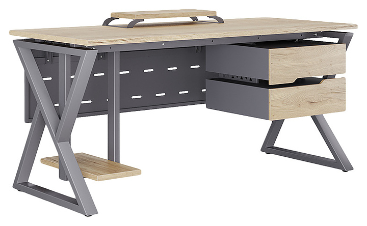 Компьютерный стол Кобор КW-120/60 graphite/natural используется в офисных помещениях и кабинетах руководителей. Модель оснащена W-образными опорами. Каркас выполнен из металла, выкрашенного в цвет графит муар (RAL7024), столешница – из ламинированной древесно-стружечной плиты (ЛДСП) цвета натуральный дуб (H1180 ST37). Опции (заказываются отдельно):