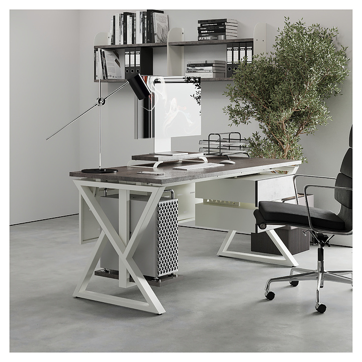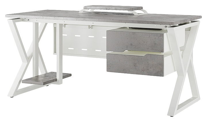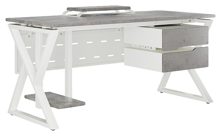 Компьютерный стол Кобор КW-140/60 white/chicago используется в офисных помещениях и кабинетах руководителей. Модель оснащена W-образными опорами. Каркас выполнен из металла, выкрашенного в цвет белый муар (RAL9016), столешница – из ламинированной древесно-стружечной плиты (ЛДСП) цвета бетон чикаго (F186 ST9). Опции (заказываются отдельно):