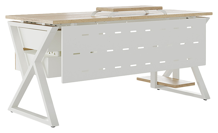 Компьютерный стол Кобор KW-180/60 white/natural используется в офисных помещениях и кабинетах руководителей. Модель оснащена W-образными опорами. Каркас выполнен из металла, выкрашенного в цвет белый муар (RAL9016), столешница – из ламинированной древесно-стружечной плиты (ЛДСП) цвета натуральный дуб (H1180 ST37). Опции (заказываются отдельно):
