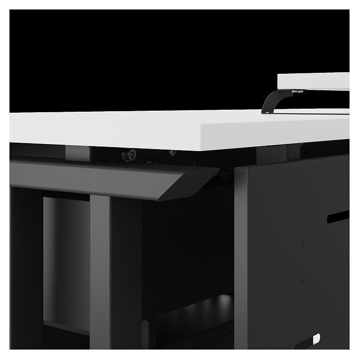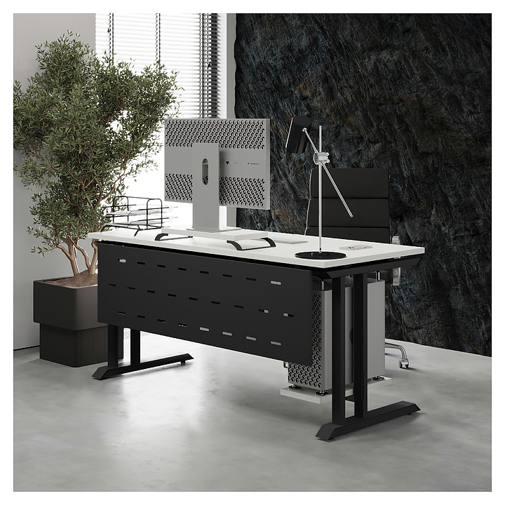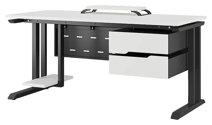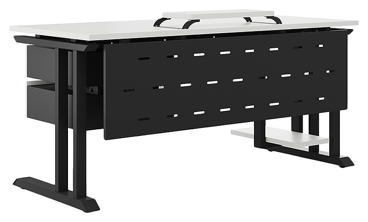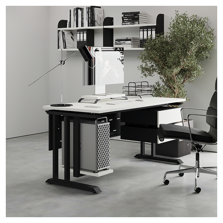 Компьютерный стол Кобор KL1-120/70 black/premium используется в офисных помещениях и кабинетах руководителей. Модель оснащена L-образными опорами. Каркас выполнен из металла, выкрашенного в цвет черный муар (RAL9005), столешница – из ламинированной древесно-стружечной плиты (ЛДСП) цвета белый премиум (W1000 S9). Опции (заказываются отдельно):