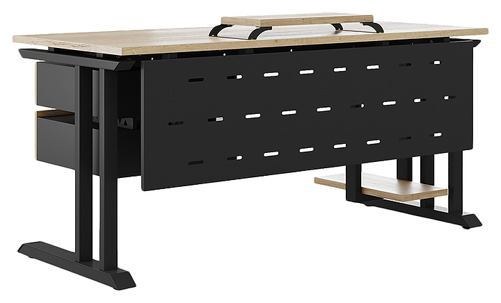 Компьютерный стол Кобор КL1-180/80 black/natural используется в офисных помещениях и кабинетах руководителей. Модель оснащена L-образными опорами. Каркас выполнен из металла, выкрашенного в цвет черный муар (RAL9005), столешница – из ламинированной древесно-стружечной плиты (ЛДСП) цвета натуральный дуб (H1180 ST37). Опции (заказываются отдельно):