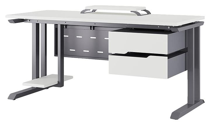 Компьютерный стол Кобор KL1-120/80 graphite/premium используется в офисных помещениях и кабинетах руководителей. Модель оснащена L-образными опорами. Каркас выполнен из металла, выкрашенного в цвет графит муар (RAL7024), столешница – из ламинированной древесно-стружечной плиты (ЛДСП) цвета белый премиум (W1000 ST9). Опции (заказываются отдельно):