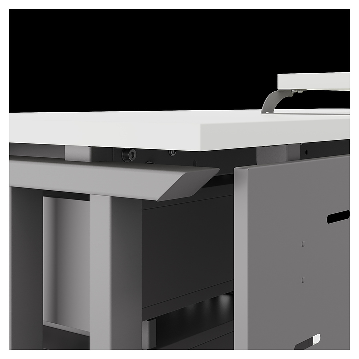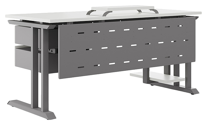 Компьютерный стол Кобор KL1-120/70 aluminum/premium используется в офисных помещениях и кабинетах руководителей. Модель оснащена L-образными опорами. Каркас выполнен из металла, выкрашенного в цвет алюминиевый металлик (RAL9006), столешница – из ламинированной древесно-стружечной плиты (ЛДСП) цвета белый премиум (W1000 ST9). Опции (заказываются отдельно):