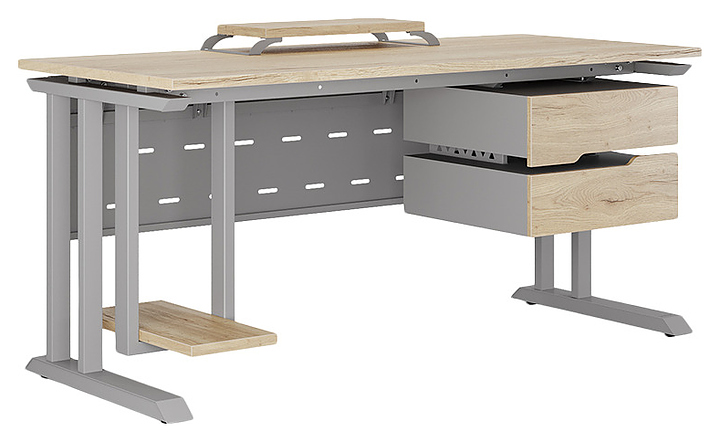 Компьютерный стол Кобор KL1-180/60 aluminum/natural используется в офисных помещениях и кабинетах руководителей. Модель оснащена L-образными опорами. Каркас выполнен из металла, выкрашенного в цвет алюминиевый металлик (RAL9006), столешница – из ламинированной древесно-стружечной плиты (ЛДСП) цвета натуральный дуб (H1180 ST37). Опции (заказываются отдельно):