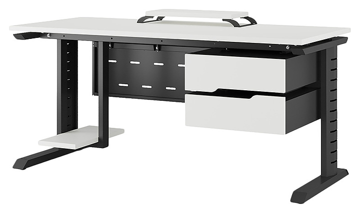 Компьютерный стол Кобор КL2-180/70 black/premium используется в офисных помещениях и кабинетах руководителей. Модель оснащена L-образными опорами с декоративной вставкой на боковинах. Каркас выполнен из металла, выкрашенного в цвет черный муар (RAL9005), столешница – из ламинированной древесно-стружечной плиты (ЛДСП) цвета белый премиум (W1000 S9). Опции (заказываются отдельно):