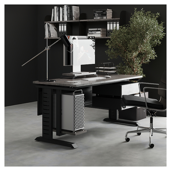 Компьютерный стол Кобор KL2-100/60 black/chicago используется в офисных помещениях и кабинетах руководителей. Модель оснащена L-образными опорами с декоративной вставкой на боковинах. Каркас выполнен из металла, выкрашенного в цвет черный муар (RAL9005), столешница – из ламинированной древесно-стружечной плиты (ЛДСП) цвета бетон чикаго (F186 ST9). Опции (заказываются отдельно):