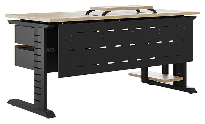 Компьютерный стол Кобор KL2-120/80 black/natural используется в офисных помещениях и кабинетах руководителей. Модель оснащена L-образными опорами с декоративными вставками на боковинах. Каркас выполнен из металла, выкрашенного в цвет черный муар (RAL9005), столешница – из ламинированной древесно-стружечной плиты (ЛДСП) цвета натуральный дуб (H1180 ST37). Опции (заказываются отдельно):