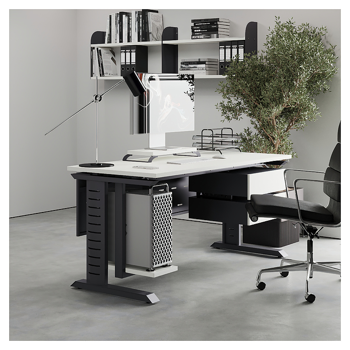 Компьютерный стол Кобор КL2-140/70 graphite/premium используется в офисных помещениях и кабинетах руководителей. Модель оснащена L-образными опорами с декоративными вставками на боковинах. Каркас выполнен из металла, выкрашенного в цвет графит муар (RAL7024), столешница – из ламинированной древесно-стружечной плиты (ЛДСП) цвета белый премиум (W1000 ST9). Опции (заказываются отдельно):