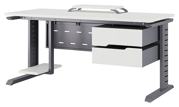 Компьютерный стол Кобор КL2-80/80 graphite/premium используется в офисных помещениях и кабинетах руководителей. Модель оснащена L-образными опорами с декоративными вставками на боковинах. Каркас выполнен из металла, выкрашенного в цвет графит муар (RAL7024), столешница – из ламинированной древесно-стружечной плиты (ЛДСП) цвета белый премиум (W1000 ST9). Опции (заказываются отдельно):