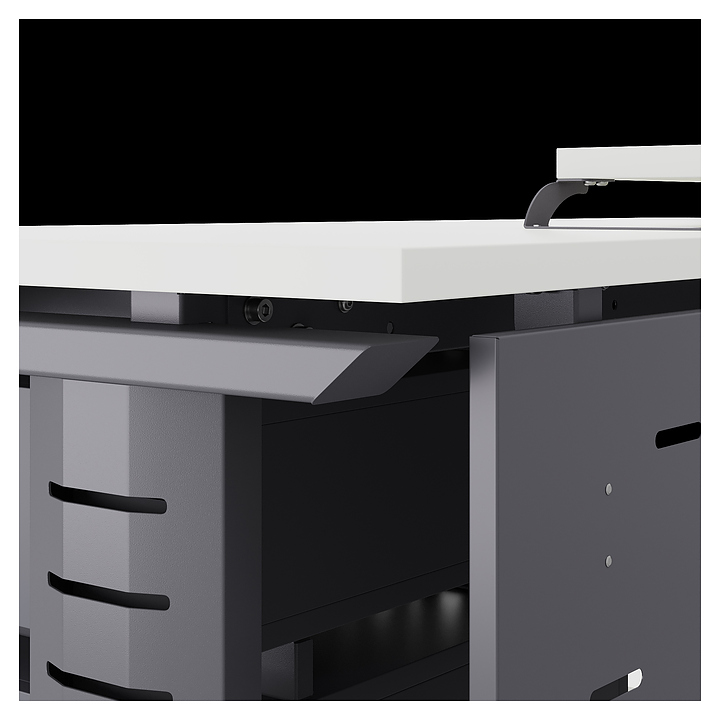 Компьютерный стол Кобор KL2-160/80 graphite/premium используется в офисных помещениях и кабинетах руководителей. Модель оснащена L-образными опорами с декоративными вставками на боковинах. Каркас выполнен из металла, выкрашенного в цвет графит муар (RAL7024), столешница – из ламинированной древесно-стружечной плиты (ЛДСП) цвета белый премиум (W1000 ST9). Опции (заказываются отдельно):