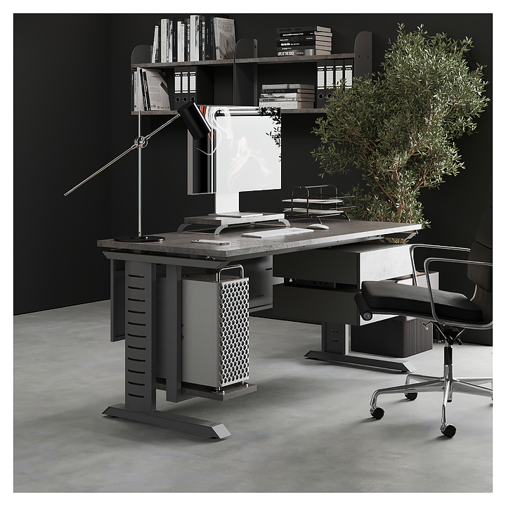 Компьютерный стол Кобор КL2-100/60 aluminum/chicago используется в офисных помещениях и кабинетах руководителей. Модель оснащена L-образными опорами с декоративными вставками на боковинах. Каркас выполнен из металла, выкрашенного в цвет алюминиевый металлик (RAL9006), столешница – из ламинированной древесно-стружечной плиты (ЛДСП) цвета бетон чикаго (F186 ST9). Опции (заказываются отдельно):