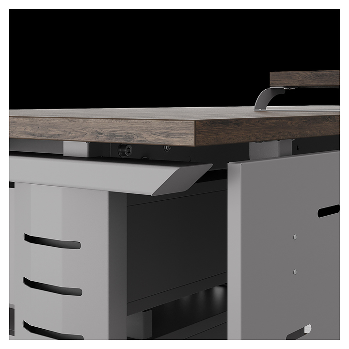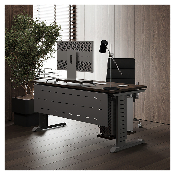 Компьютерный стол Кобор КL2-100/80 aluminum/charlston используется в офисных помещениях и кабинетах руководителей. Модель оснащена L-образными опорами с декоративными вставками на боковинах. Каркас выполнен из металла, выкрашенного в цвет алюминиевый металлик (RAL9006), столешница – из ламинированной древесно-стружечной плиты (ЛДСП) цвета дуб чарльстон (H3154 ST36). Опции (заказываются отдельно):