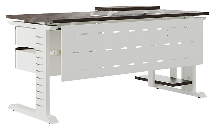 Компьютерный стол Кобор KL2-160/70 white/charlston используется в офисных помещениях и кабинетах руководителей. Модель оснащена L-образными опорами с декоративными вставками на боковинах. Каркас выполнен из металла, выкрашенного в цвет белый муар (RAL9016), столешница – из ламинированной древесно-стружечной плиты (ЛДСП) цвета дуб чарльстон (H3154 ST36). Опции (заказываются отдельно):