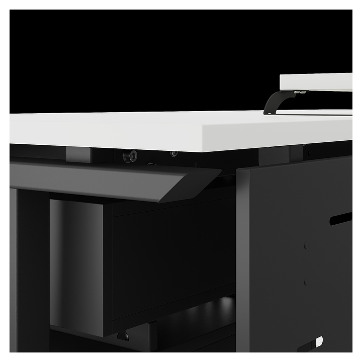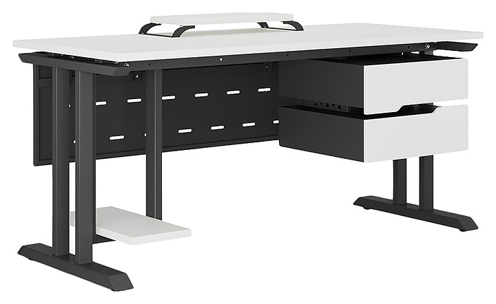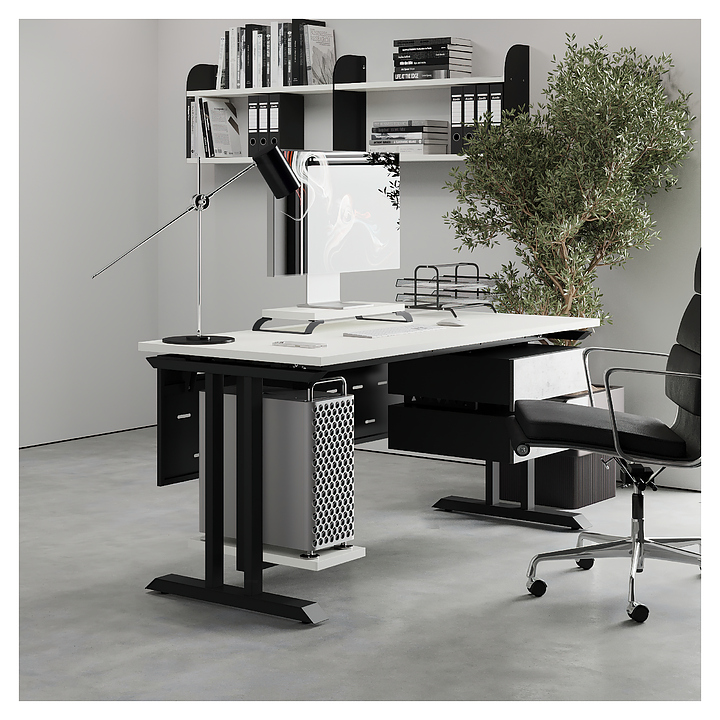 Компьютерный стол Кобор KT-140/60 black/premium используется в офисных помещениях и кабинетах руководителей. Модель оснащена T-образными опорами. Каркас выполнен из металла, выкрашенного в цвет черный муар (RAL9005), столешница – из ламинированной древесно-стружечной плиты (ЛДСП) цвета белый премиум (W1000 S9). Опции (заказываются отдельно):