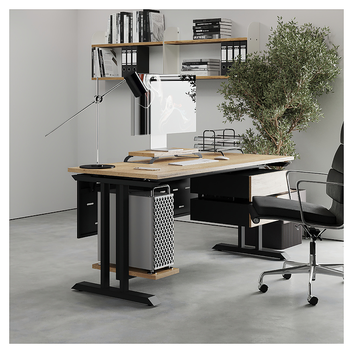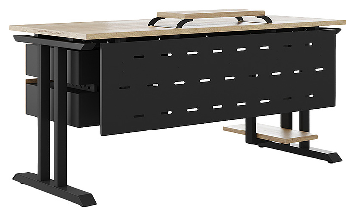 Компьютерный стол Кобор КT-140/70 black/natural используется в офисных помещениях и кабинетах руководителей. Модель оснащена T-образными опорами. Каркас выполнен из металла, выкрашенного в цвет черный муар (RAL9005), столешница – из ламинированной древесно-стружечной плиты (ЛДСП) цвета натуральный дуб (H1180 ST37). Опции (заказываются отдельно):