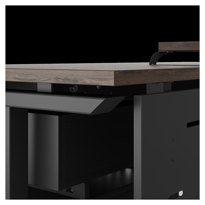 Компьютерный стол Кобор КT-120/70 black/charlston используется в офисных помещениях и кабинетах руководителей. Модель оснащена T-образными опорами. Каркас выполнен из металла, выкрашенного в цвет черный муар (RAL9005), столешница – из ламинированной древесно-стружечной плиты (ЛДСП) цвета дуб чарльстон (H3154 ST36). Опции (заказываются отдельно):