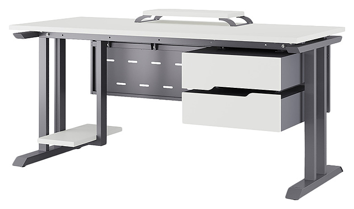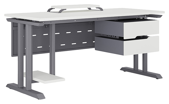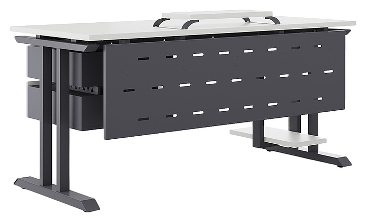 Компьютерный стол Кобор КT-140/60 graphite/premium используется в офисных помещениях и кабинетах руководителей. Модель оснащена T-образными опорами. Каркас выполнен из металла, выкрашенного в цвет графит муар (RAL7024), столешница – из ламинированной древесно-стружечной плиты (ЛДСП) цвета белый премиум (W1000 ST9). Опции (заказываются отдельно):