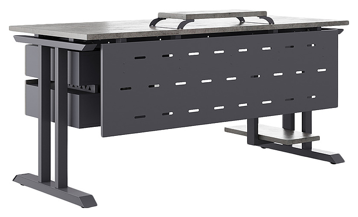 Компьютерный стол Кобор KT-120/70 graphite/chicago используется в офисных помещениях и кабинетах руководителей. Модель оснащена T-образными опорами. Каркас выполнен из металла, выкрашенного в цвет графит муар (RAL7024), столешница – из ламинированной древесно-стружечной плиты (ЛДСП) цвета бетон чикаго (F186 ST9). Опции (заказываются отдельно):