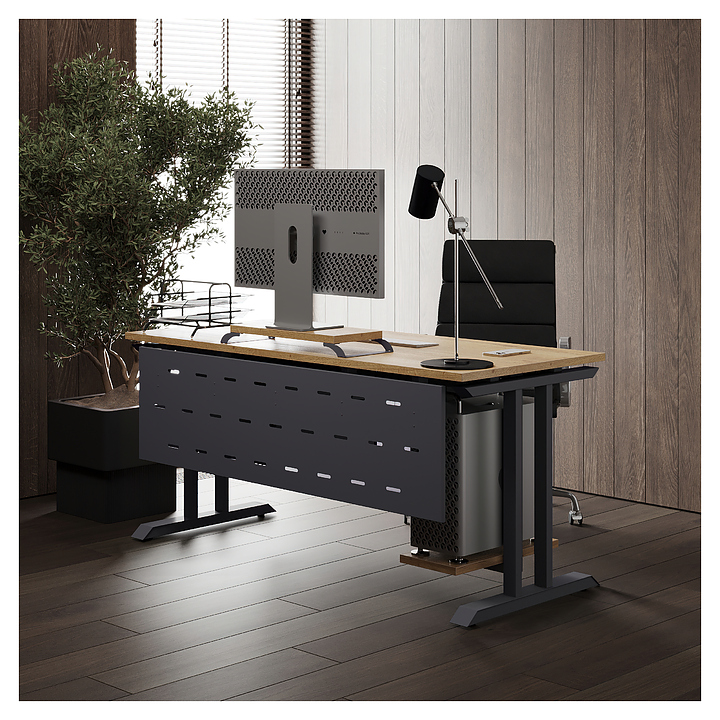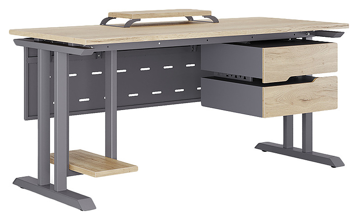 Компьютерный стол Кобор КT-180/80 graphite/natural используется в офисных помещениях и кабинетах руководителей. Модель оснащена T-образными опорами. Каркас выполнен из металла, выкрашенного в цвет графит муар (RAL7024), столешница – из ламинированной древесно-стружечной плиты (ЛДСП) цвета натуральный дуб (H1180 ST37). Опции (заказываются отдельно):